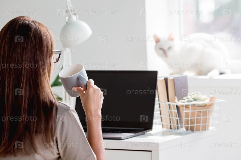 Молодая счастливая красивая деловая женщина-фрилансер сидит в домашнем офисе с ноутбуком, смартфоном и пьет кофе. Женщина работает дома. Кот на заднем плане