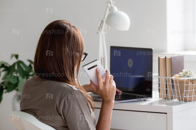 Молодая, счастливая, красивая деловая женщина-фрилансер сидит в домашнем офисе с ноутбуком и смартфоном в руках. Женщина работает дома или делает покупки в интернет-магазине