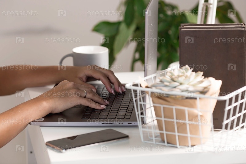 Руки внештатной женщины, сидящей в домашнем офисе с ноутбуком и смартфоном. Женщина работает дома. Начало рабочего дня. Концепция управления человеческими ресурсами и найма