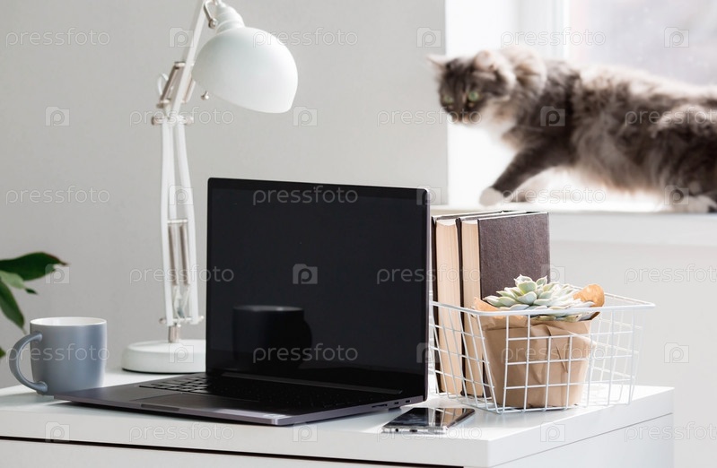 Фриланс. Офис выполнен в светлых тонах. Белый стол с ноутбуком, книгами, кружкой, цветком и телефоном. Работа на дому. Начало рабочего дня. Концепция интерьера офиса