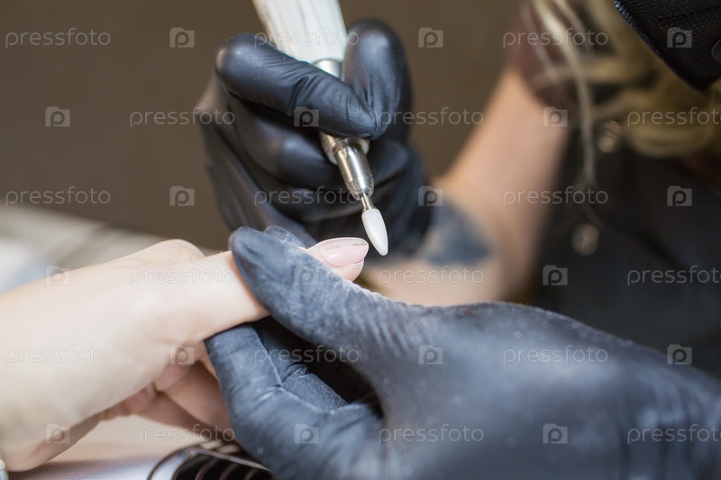 Аппаратный маникюр с использованием электрического аппарата. процедура подготовки ногтей перед нанесением лака. Руки маникюрши в черных перчатках и ногти клиента. женщина в салоне красоты