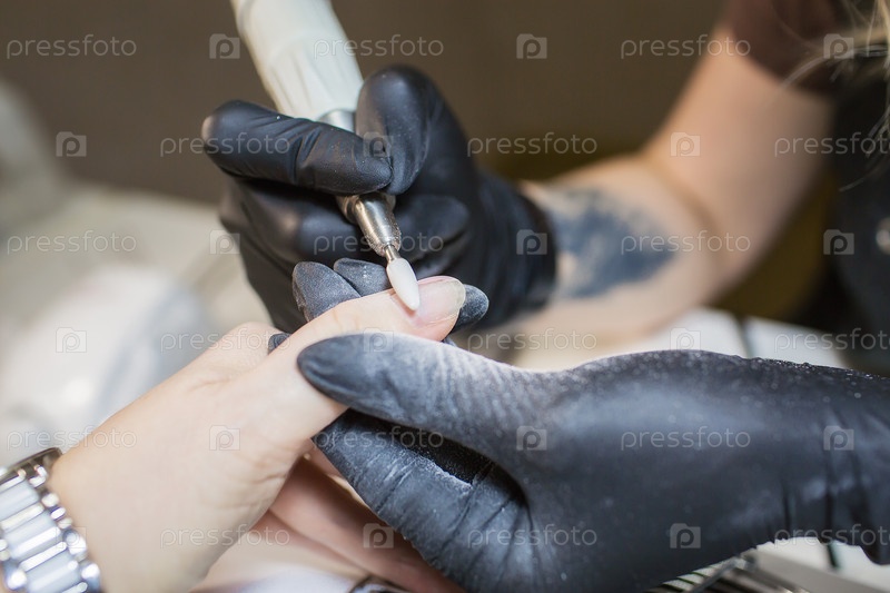 Аппаратный маникюр с использованием электрического аппарата. процедура подготовки ногтей перед нанесением лака. Руки маникюрши в черных перчатках и ногти клиента. женщина в салоне красоты