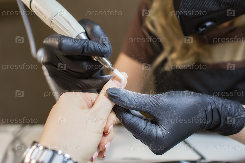Аппаратный маникюр с использованием электрического аппарата. процедура подготовки ногтей перед нанесением лака. Руки маникюрши в черных перчатках и ногти клиента. женщина в салоне красоты