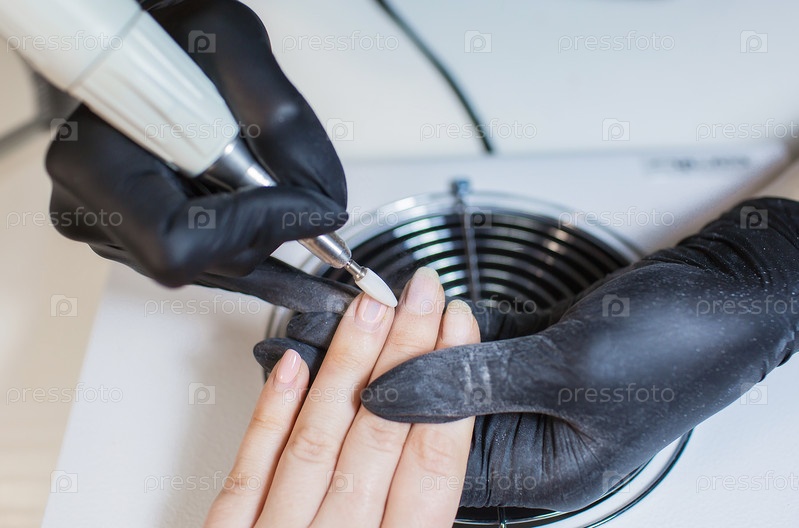 Аппаратный маникюр с использованием электрического аппарата. процедура подготовки ногтей перед нанесением лака. Руки маникюрши в черных перчатках и ногти клиента. женщина в салоне красоты