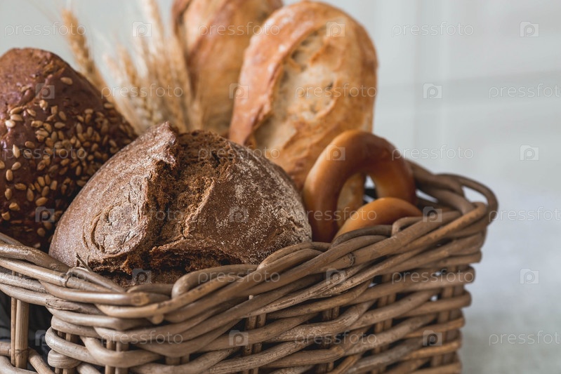 Ассортимент свежего хлеба в плетеной корзине крупным планом. Свежеиспеченный хлеб на столе. Контекст пекарни с вкусным хлебом. Кондитерские изделия