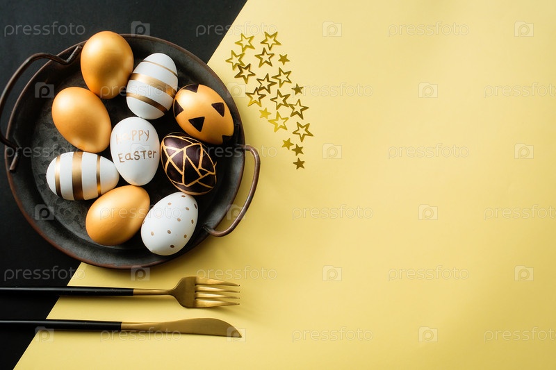 Золотые, черные, белые пасхальные яйца и конфетти в форме звездочек на желто-черном фоне. Геометрия. Минимальная концепция. Вид сверху. Карточка с местом для копирования текста