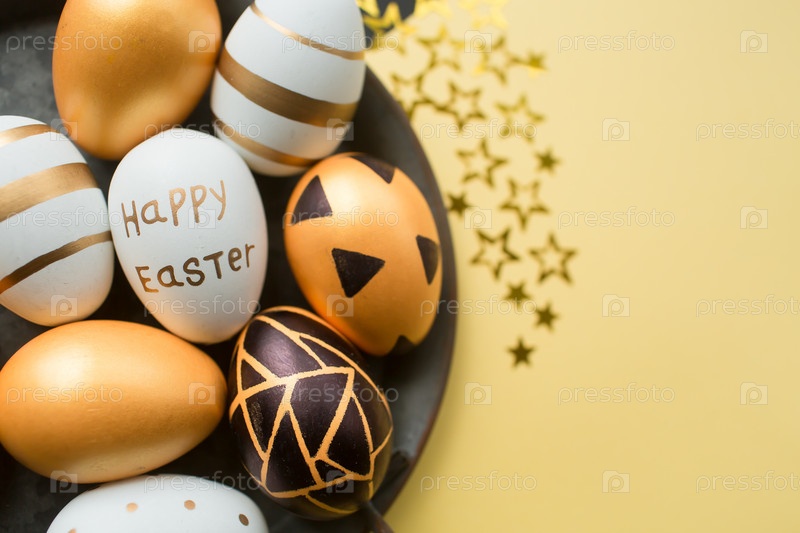 Золотые, черные, белые пасхальные яйца и конфетти в форме звездочек на желто-черном фоне. Геометрия. Минимальная концепция. Вид сверху. Карточка с местом для копирования текста