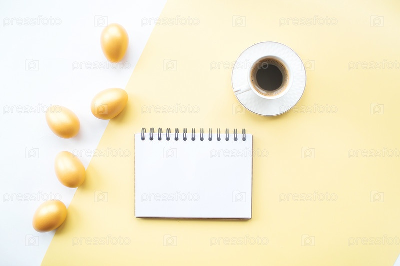 Золотые пасхальные яйца, кофейная кружка и блокнот с местом для текста на желтом фоне. Модная плоская укладка. Минимальная концепция