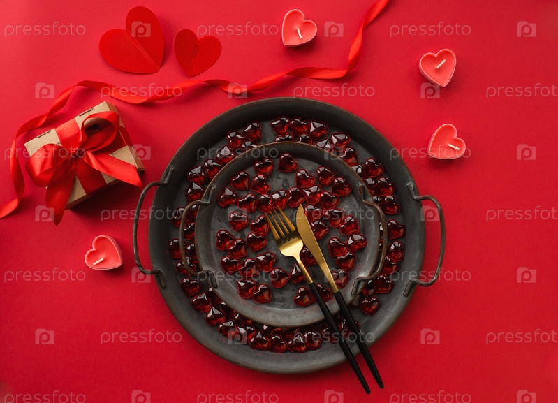 Старинные тарелки, праздничная сервировка стола с подарочной коробкой на красном фоне. Концепция любви. День Святого Валентина