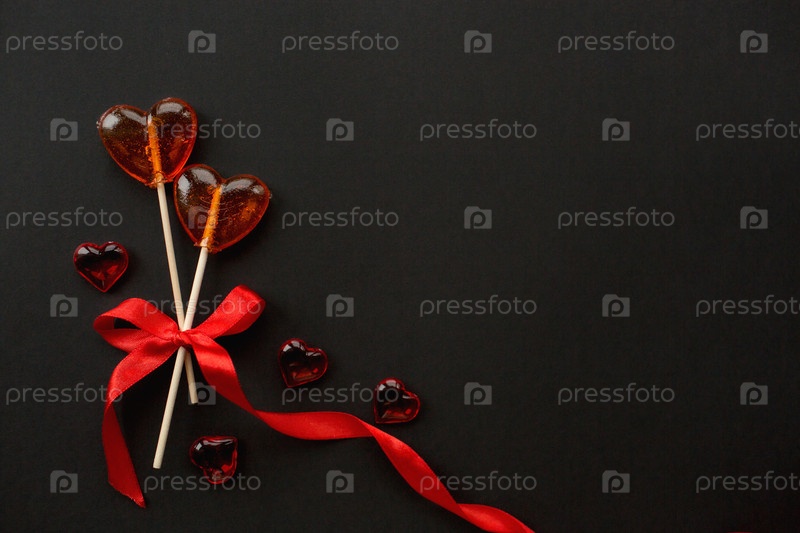 Баннер.Два сладости на палочке на черном фоне.Красные сердца. Концепция конфетной любви. День святого Валентина. Копируйте место для надписи