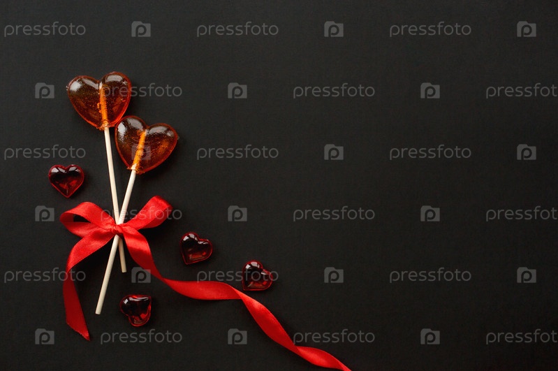 Баннер.Два сладости на палочке на черном фоне.Красные сердца. Концепция конфетной любви. День святого Валентина. Копируйте место для надписи