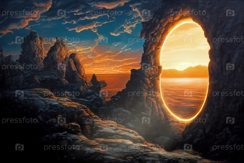 Каменный портал на морском побережье. Временная аномалия перехода из заката в рассвет. Реалистичная цифровая иллюстрация. Компьютерная графика