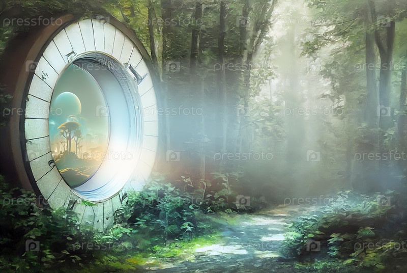 Портал в лесу ведущий в другое измерение. Реалистичная цифровая иллюстрация. Компьютерная графика
