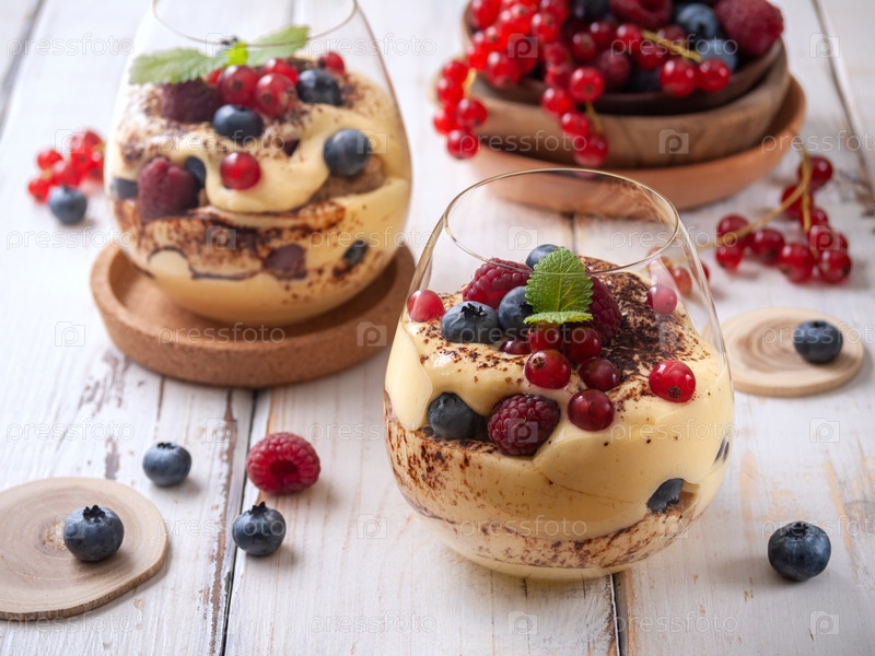 Домашний тирамису в прозрачных чашках с красной смородиной, черникой, малиной на белом деревянном столе. Горизонтальный