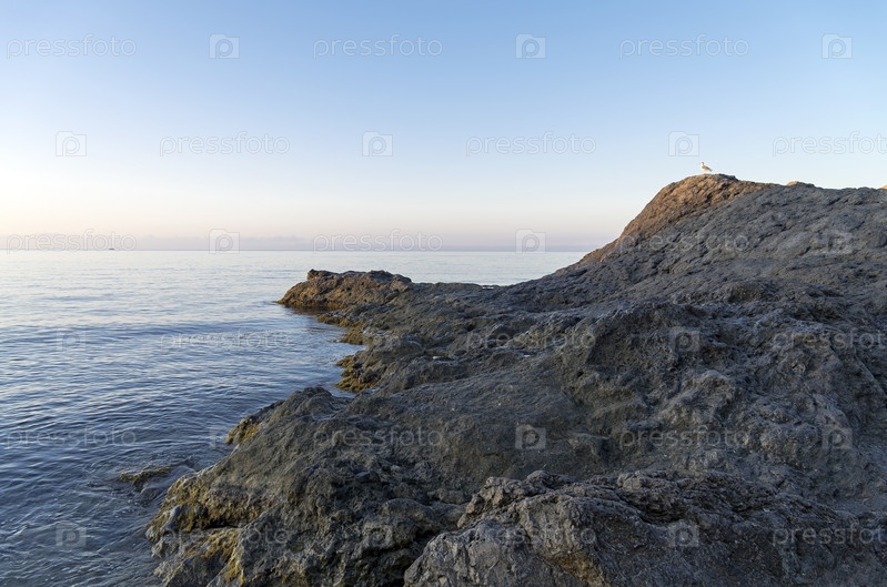 Тихое солнечное утро на берегу Черного моря. Прибрежные скалы. Крым, между Судаком и Новым Светом