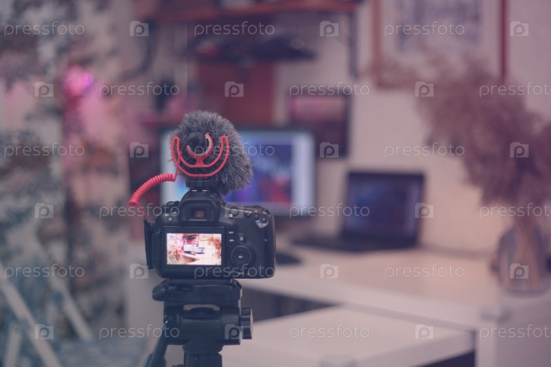 Цифровая камера с лобовым стеклом микрофона в комнате. Оборудование для блогов. Мягкий фокус ретро цвета