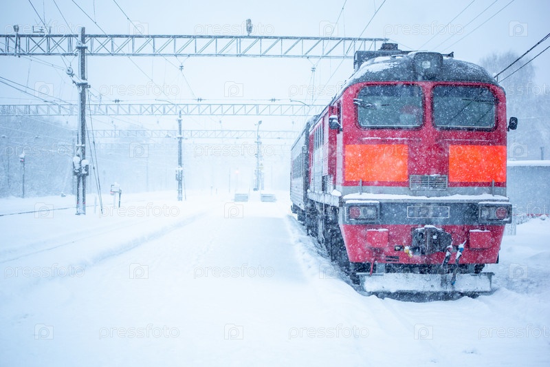 Красный локомотив на заснеженном вокзале в метель и метель
