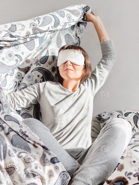 Молодая женщина в серой пижаме и маске для сна на лице. Она только что проснулась и села в постель. Раннее утро в уютном доме