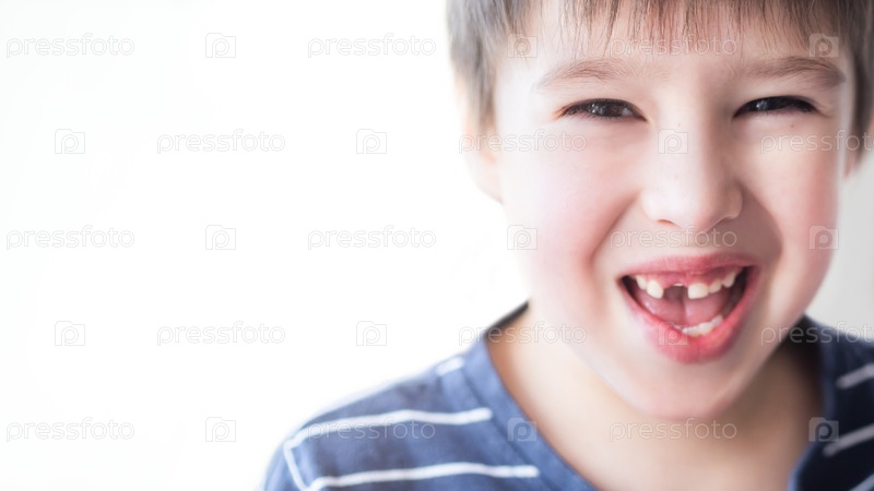 Улыбающийся малыш показывает дырку в ряду зубов во рту. Только что выпал один резец. Крупным планом фото десен для стоматолога. Копировать пространство