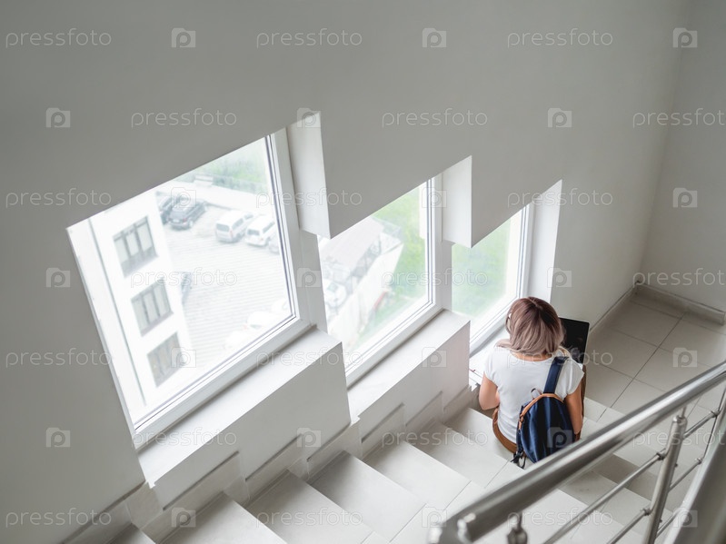 Вдумчивый студент работает с ноутбуком на лестнице в университетском городке. Женщина использует беспроводные технологии для образования. Домашнее задание онлайн. Использование Интернета для поиска информации
