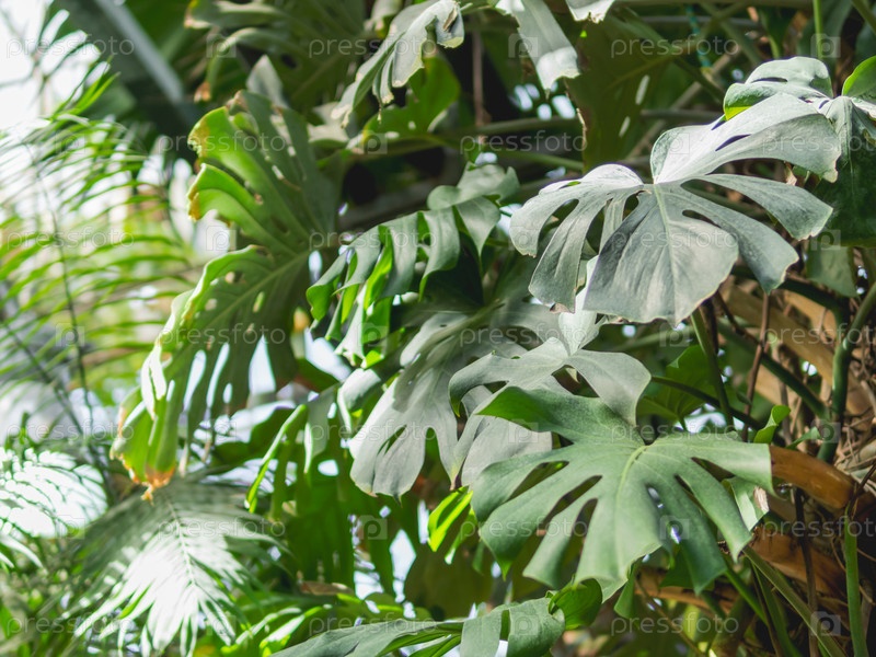 Monstera deliciosa, швейцарское сырое растение или филодендрон с расщепленными листьями. тропическое растение с большими зелеными листами в теплице