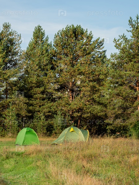 Две зеленые туристические палатки стоят в лагере возле соснового леса. Пешие прогулки по России