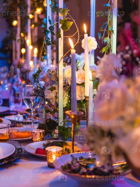 Стол сервирован для банкета со свечами и цветочными композициями. Красивые украшения в синем электрическом свете
