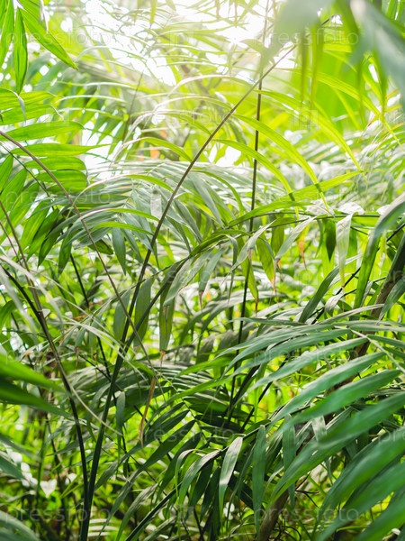 Тропические растения в теплице. Лианы и ветви пальмы с зелеными листьями в теплице