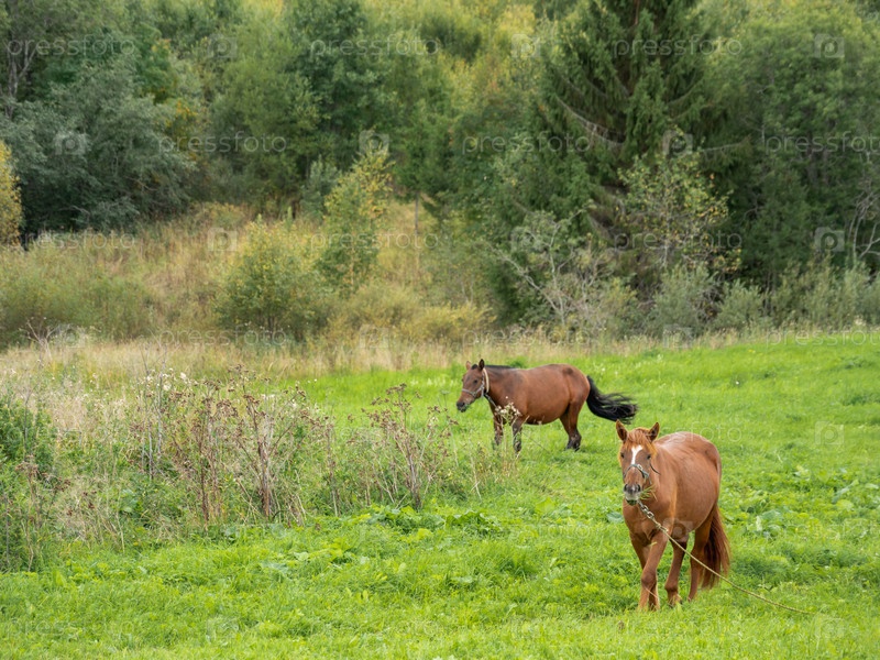 Две коричневые лошади пасутся на лугу. Сельскохозяйственные животные ходят по зеленой траве. Животноводство в сельской местности
