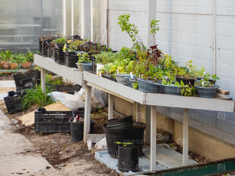 Деревянный стол с цветочными горшками и ящиками. Подготовка рассады к посадке весной. Садоводство на открытом воздухе. Рабочее место фермера, флориста или ботаника