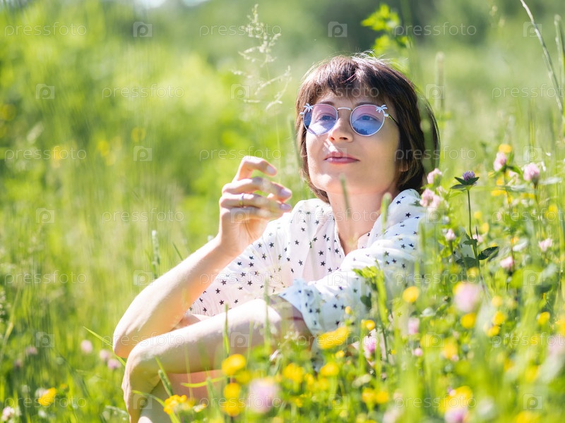 Женщина в красочных солнцезащитных очках наслаждается солнечным светом и цветочным ароматом на травяном поле. Летние вибрации. Расслабьтесь на свежем воздухе. самоуспокаивающий