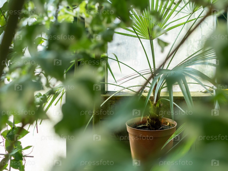 Цветочный горшок с пальмой на подоконнике. Тропическое растение растет в теплице или дома, освещенном солнечным светом