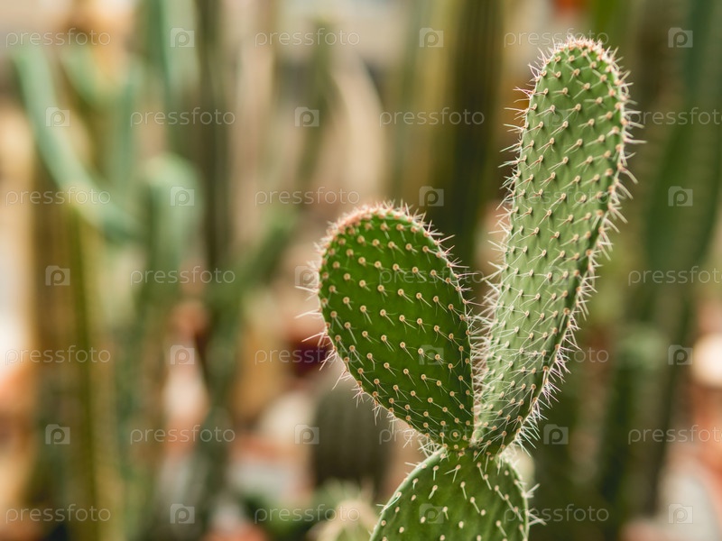 Крупным планом фото кактуса на размытом фоне коллекции различных кактусов. Ботаническое хобби или выращивание для гибридизации