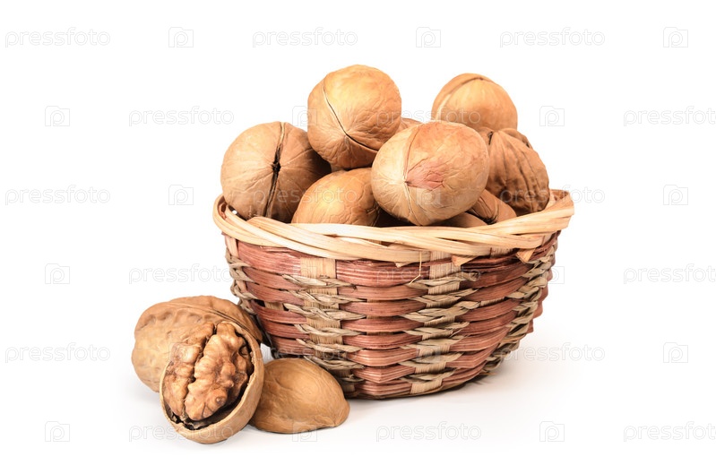 Грецкие орехи в корзине на белом фоне с мягкой тенью