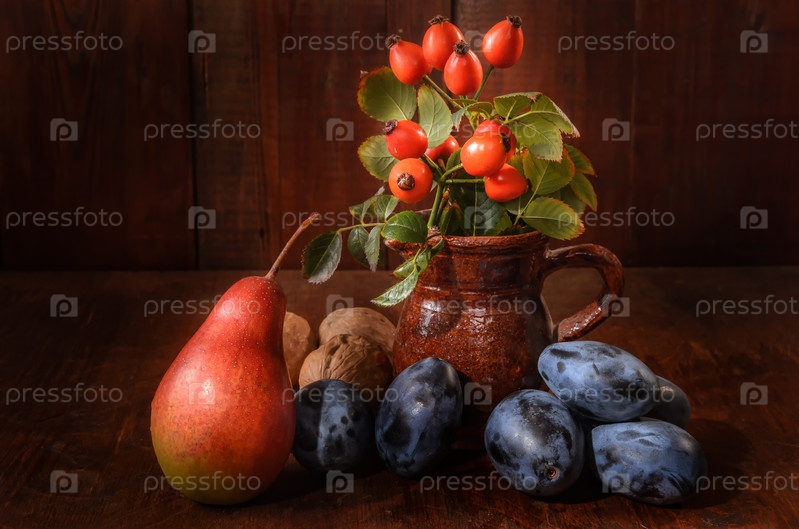Груши и сливы с веткой шиповника на темном деревянном фоне в деревенском стиле