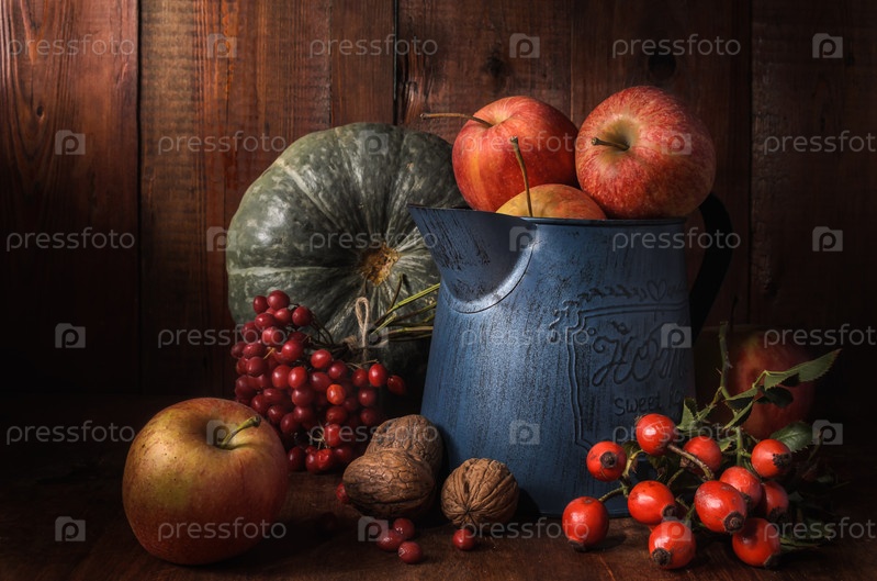 Яблоки в садовом кувшине на темном деревянном фоне в деревенском стиле