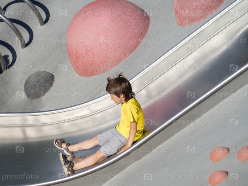 Мальчик с закрытыми глазами катается по металлической горке на современной детской спортивно-игровой площадке. Малыш преодолевает страх и учится новому. Активный отдых на природе. Спортивный образ жизни