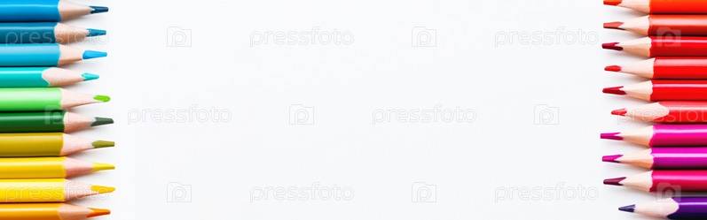 Ряды цветных карандашей на белом фоне. Школьные принадлежности с копией пространства на белом фоне. Вид сверху на детские канцелярские принадлежности. Назад к школьному фону