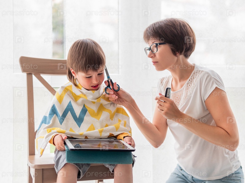 Мать сама подстригает сына. Маленький мальчик сидит с цифровым планшетом