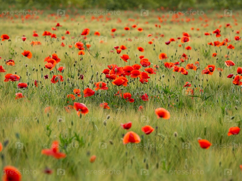 Красные цветы мака на ржаном поле. Зеленые растения с красными бутонами. Красивые и хрупкие цветы летом