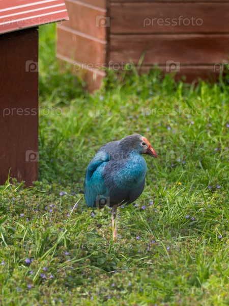 Полнометражный портрет серого болота или Porphyrio poliocephalus, стоящего в траве.Красочная птица на открытом воздухе