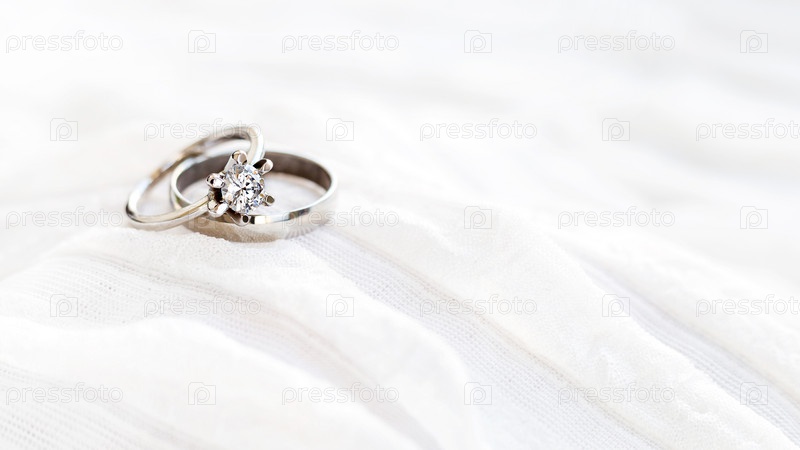 Пара золотых обручальных колец на белом текстильном фоне с копией пространства. Обручальное кольцо с бриллиантом на фоне ткани. Символ любви и брака