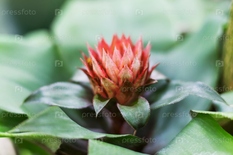 Ярко-красный цветок эхмеи. Крупный план цветущего растения семейства бромелиевых