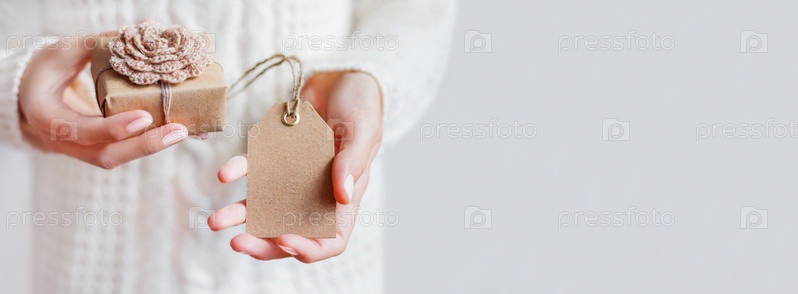 Женщина в белом вязаном свитере держит рождественский подарок из крафт-бумаги с цветком ручной вязки. Очистить тег для вашего текста. Новогодний макет. Горизонтальный фон с копией пространства