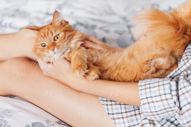 Женщина обнимает милый рыжий кот. Пушистое домашнее животное с владельцем питомца в спальне