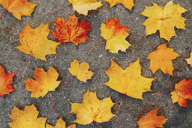 Ярко-желтые и оранжевые кленовые листья лежат на асфальтовом тротуаре. Осенний естественный фон. Плоская планировка, вид сверху