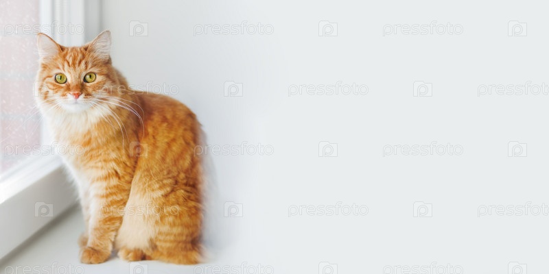 Любопытный рыжий кот сидит на подоконнике. Пушистый питомец дома, пока на улице идет снег. Хорошие стеклопакеты делают дом теплым и уютным. Белый фон с копией пространства