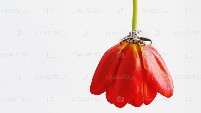 Пара обручальных и обручальных колец с бриллиантом на красном тюльпане. Белый фон с символом любви и брака и копией пространства