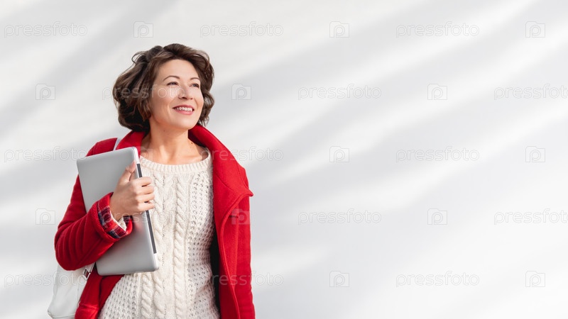 Кудрявая женщина в красном пальто. Улыбающийся взрослый студент с ноутбуком. Фрилансер с портативным устройством для работы. Современный образ жизни. Белая стена с копией пространства