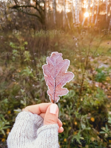 Женщина держит дубовый опавший лист, покрытый инеем. Первые заморозки осенью. Поздняя осень в лесу